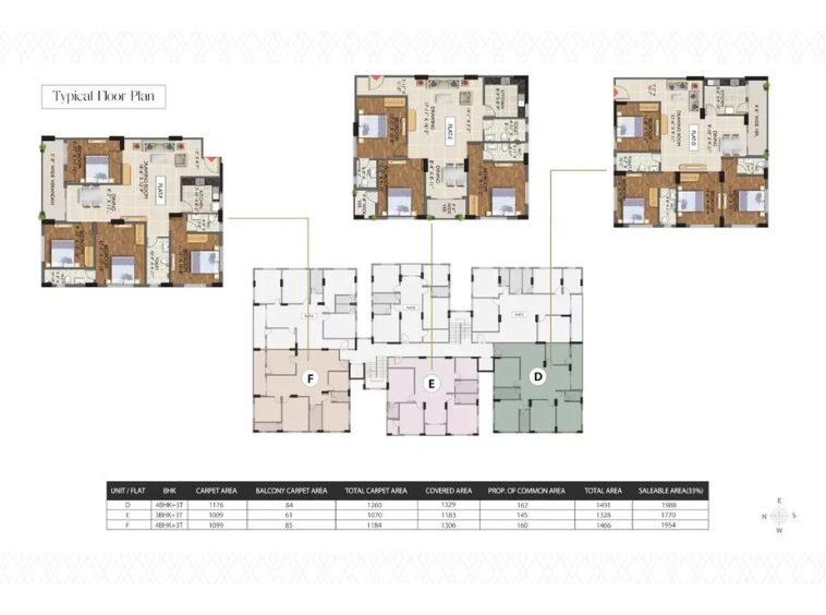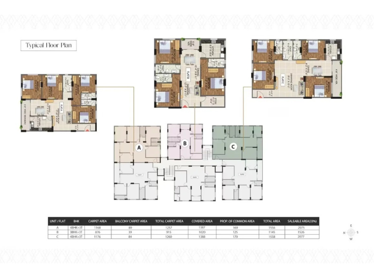 Spacious 3BHK+3T layouts in two size variants (1526 & 1770 sqft). Feature 3-sided openness, attached bathrooms, modular kitchens, balconies, and premium finishes throughout. Designed for optimal ventilation and natural light.